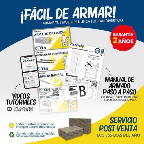 Nuestros productos se entregan desarmados en cajas de cartón corrugado de alta resistencia, cubiertas con un film termocontraíble que las protege del deterioro ocasionado por el traslado. En su interior cuentan con las piezas y herrajes necesarios para armar los muebles.